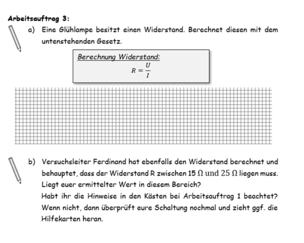 Dieses Modul soll den Schülerinnen und Schülern den sachgerechten Umgang mit Messgeräten vermitteln. Hierzu wird ein Experiment aus dem Bereich der Elektrizitätslehre verwendet, in dem die Schülerinnen und Schüler ein Amperemeter und ein Voltmeter in einen Stromkreis bestehend aus Spannungsquelle und Glühlampe integrieren.